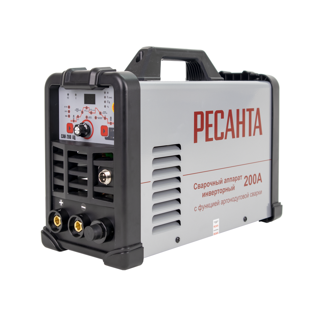 Сварочный аппарат РЕСАНТА САИ-200АД – современный портативный однофазный инверторный сварочный аппарат с функцией аргонодуговой сварки постоянным током (TIG DC). Данный аппарат изготовлен по передовой IGBT технологии. Аппарат позволяет производить: Сварку постоянным током неплавящимся электродом в среде защитного газа углеродистых и нержавеющих сталей (режим TIG). Сварка осуществляется постоянным током в среде аргона. Отличительной особенностью рассматриваемого вида сварки являются два главных компонента: неплавящийся электрод и защитный газ (аргон). Сварка-SPOT позволяет выполнить быстро и качественно соединение листов металлических конструкций с применением местного воздействия тока определенной силы и нагрева свариваемых заготовок. В тех зонах, где электроды касаются металла, происходит его плавление Защита электрической дуги необходима с целью препятствия вступления расплавляемого металла в контакт с окружающей средой, поскольку данное взаимодействие (при окислении азота и кислорода) приводит к образованию оксидов и нитритов, наличие которых в металле приводит к дефектам сварного шва. С этой целью и применяются защитные газы в баллонах, например, аргон. Ручную дуговую сварку штучным покрытым электродом на постоянном токе электродами с рутиловым и основным покрытием (режим ММА). Для сварки электродом защитный газ не требуется