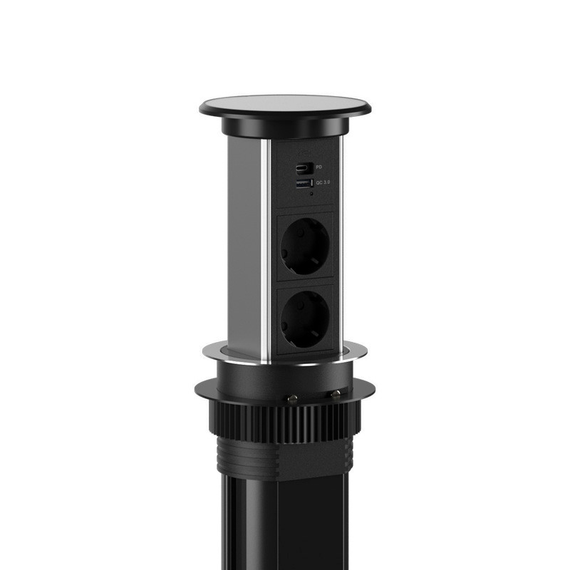 Shelbi STVA-4-WC-IP54-S – выдвижной автоматический настольный розеточный блок с высокой степенью защиты IP54, обеспечивающий надежную защиту от пыли и влаги. Отличное решение для офисов, кухонь, рабочих зон и других помещений, требующих удобного доступа к электропитанию и зарядке мобильных устройств.