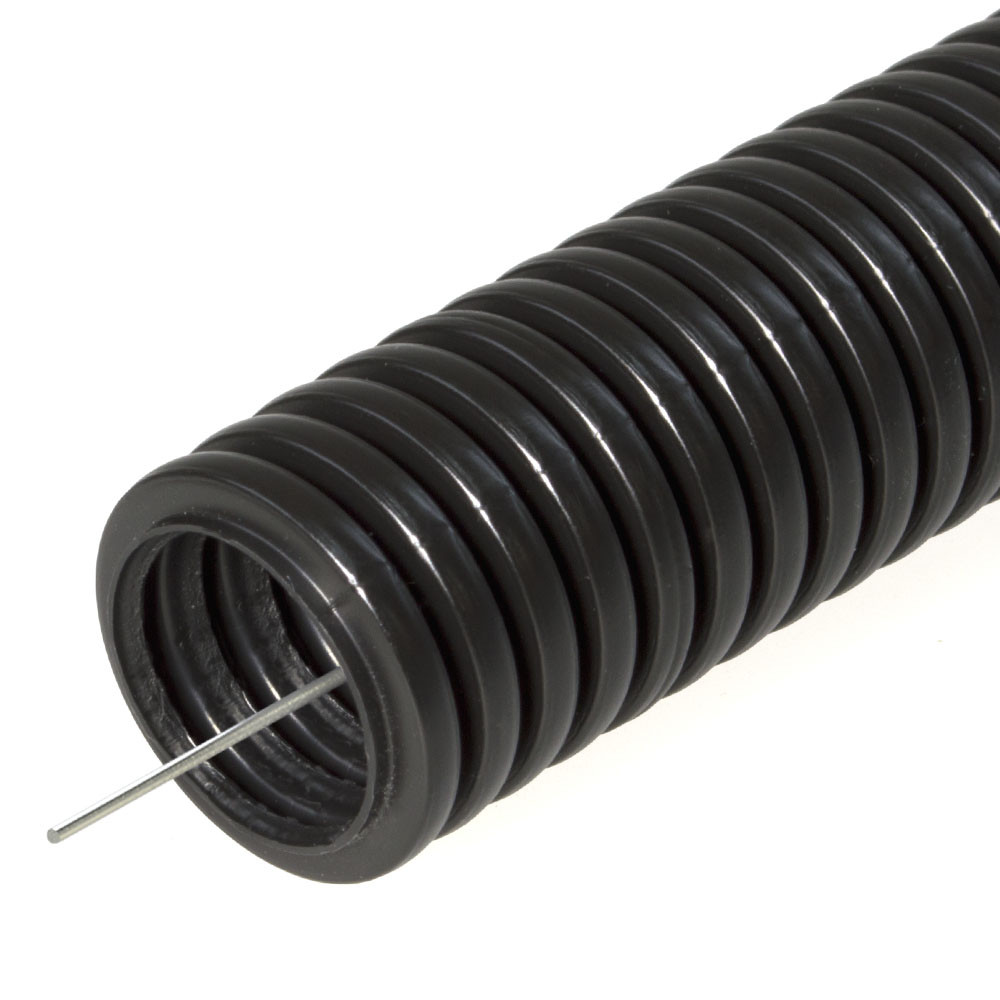 Гофрированная труба ПНД, легкая, 350 Н, безгалогенная (HF), стойкая к ультрафиолету, черная, d20 мм. Упаковка: 100 м, паллета: 4800 м.